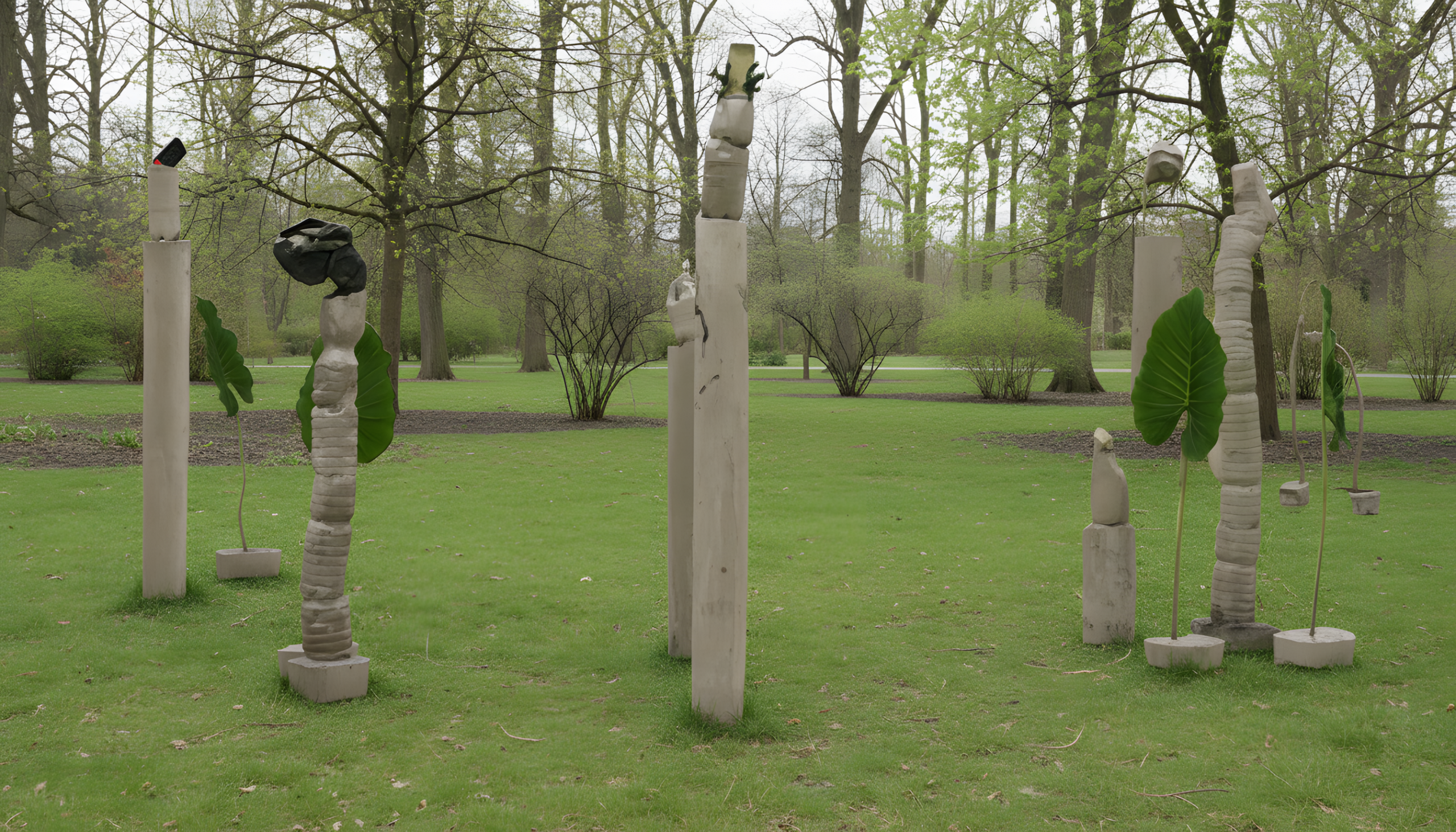 Sculptures in concrete that incorporate plastic plants, soundscape and video
