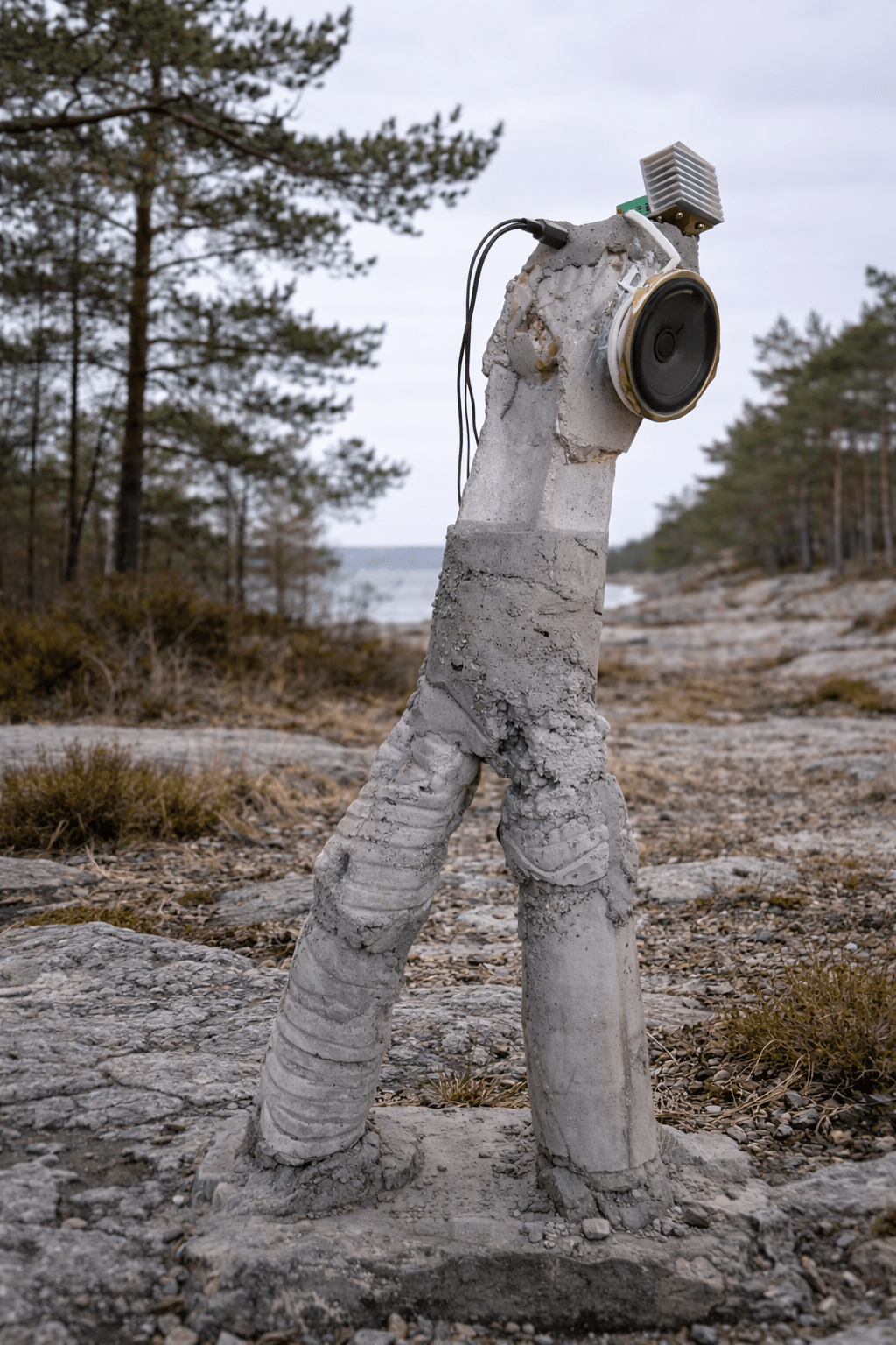 Skulpturen aus Beton, Plastikpflanzen, Soundscape und Video