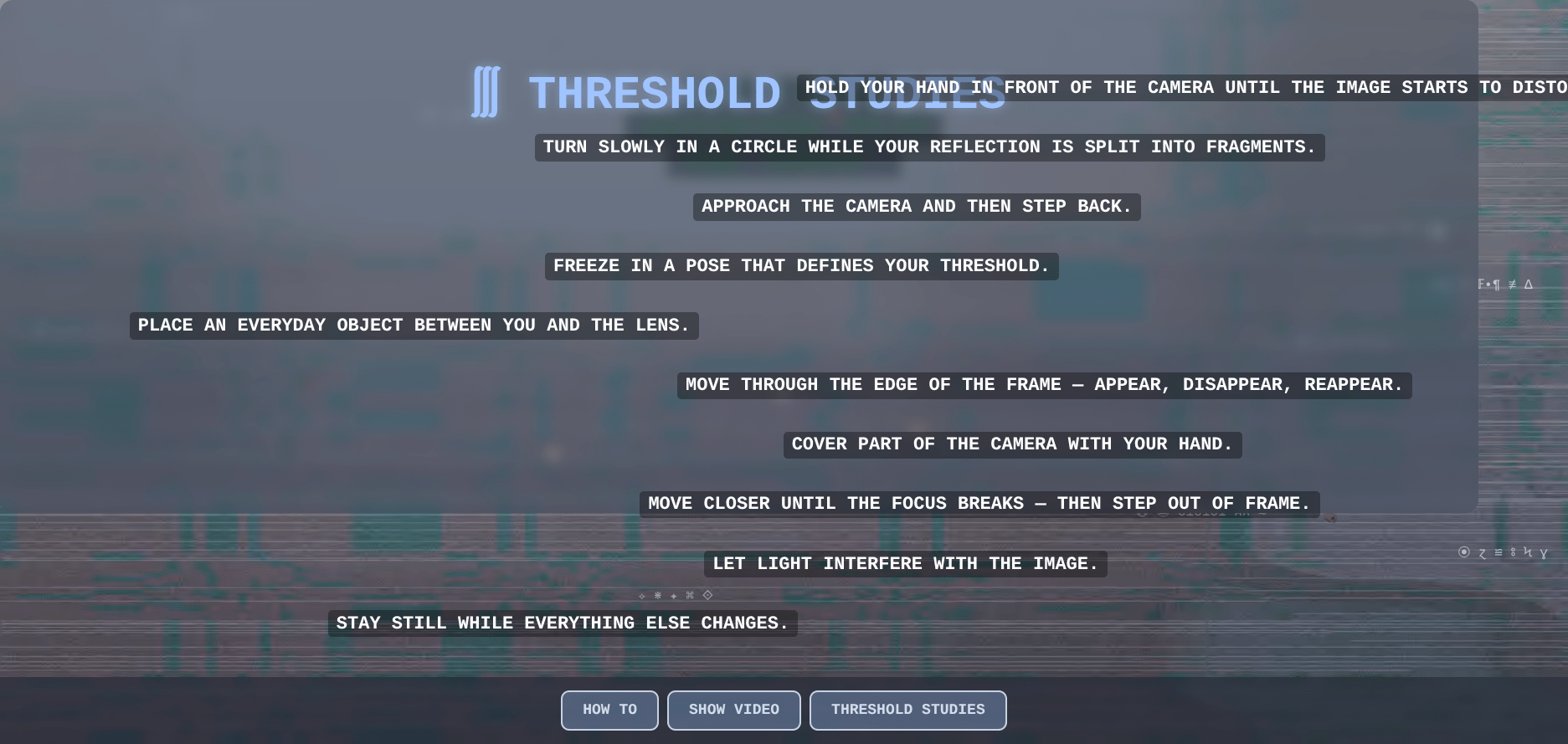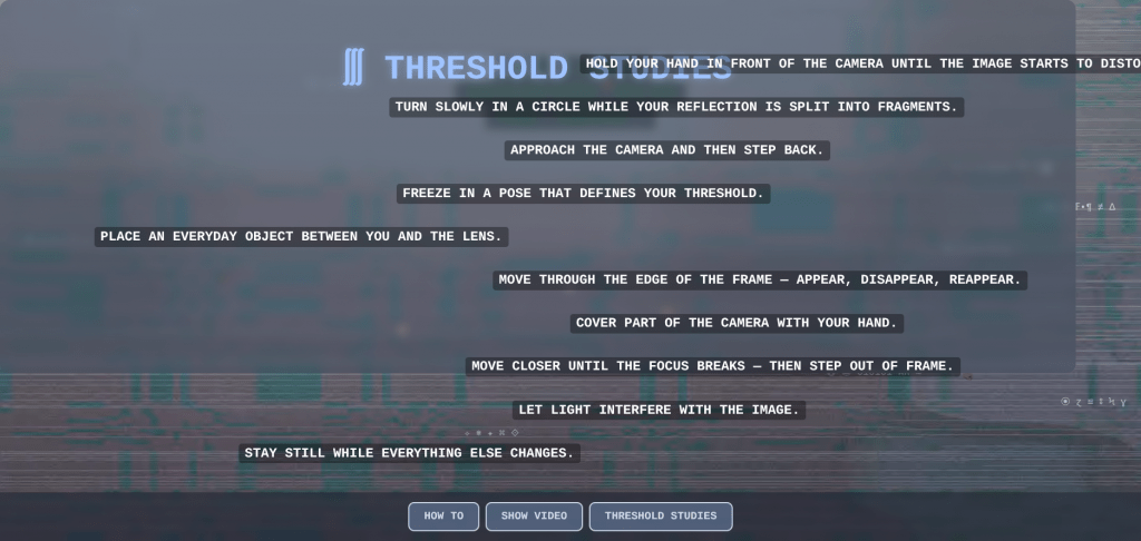 Threshold Studies invites participants to respond and co-create brief encounters that shift between clarity and disruption.